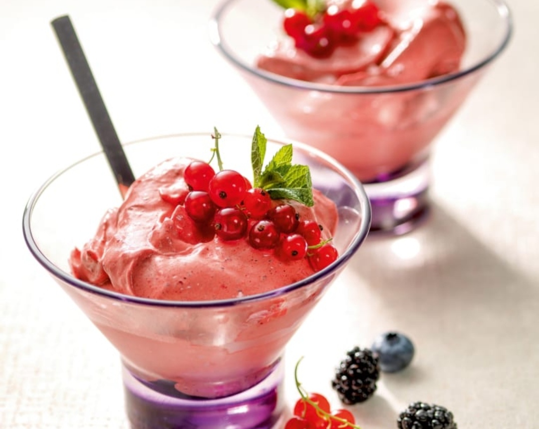 Coloque la mariposa en las cuchillas , incorpore las claras y bata 2 min/vel 4. Sirva fría en cuencos de postre, adornada con los frutos rojos frescos.