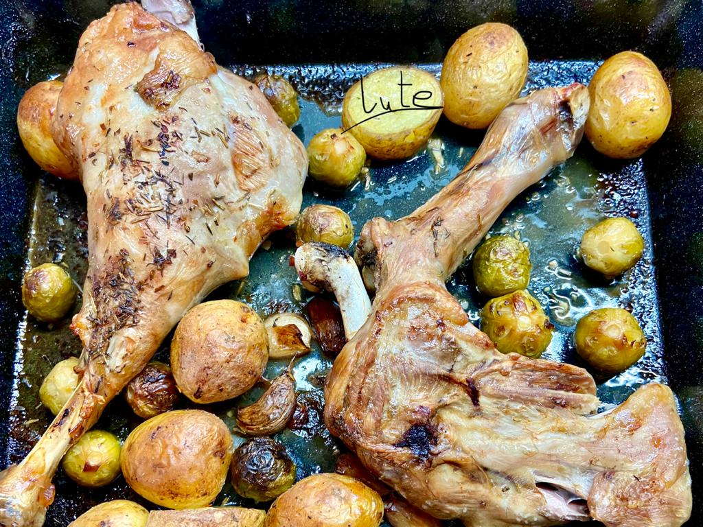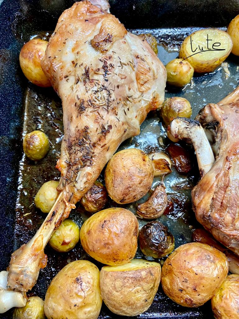 4.- Si las vais a hacer otro dia, dejáis enfriar las piernas dentro de la bolsa y congeláis hasta el dia que tengáis previsto comerlas como os he comentado antes. Si las vais a hacer ahora, sacar las piernas de la bolsa y colocarlas en una fuente de horno, poner las coles de bruselas alrededor. Sacar el cestillo y poner las patatas repartidas en la fuente junto a la carne y las coles.