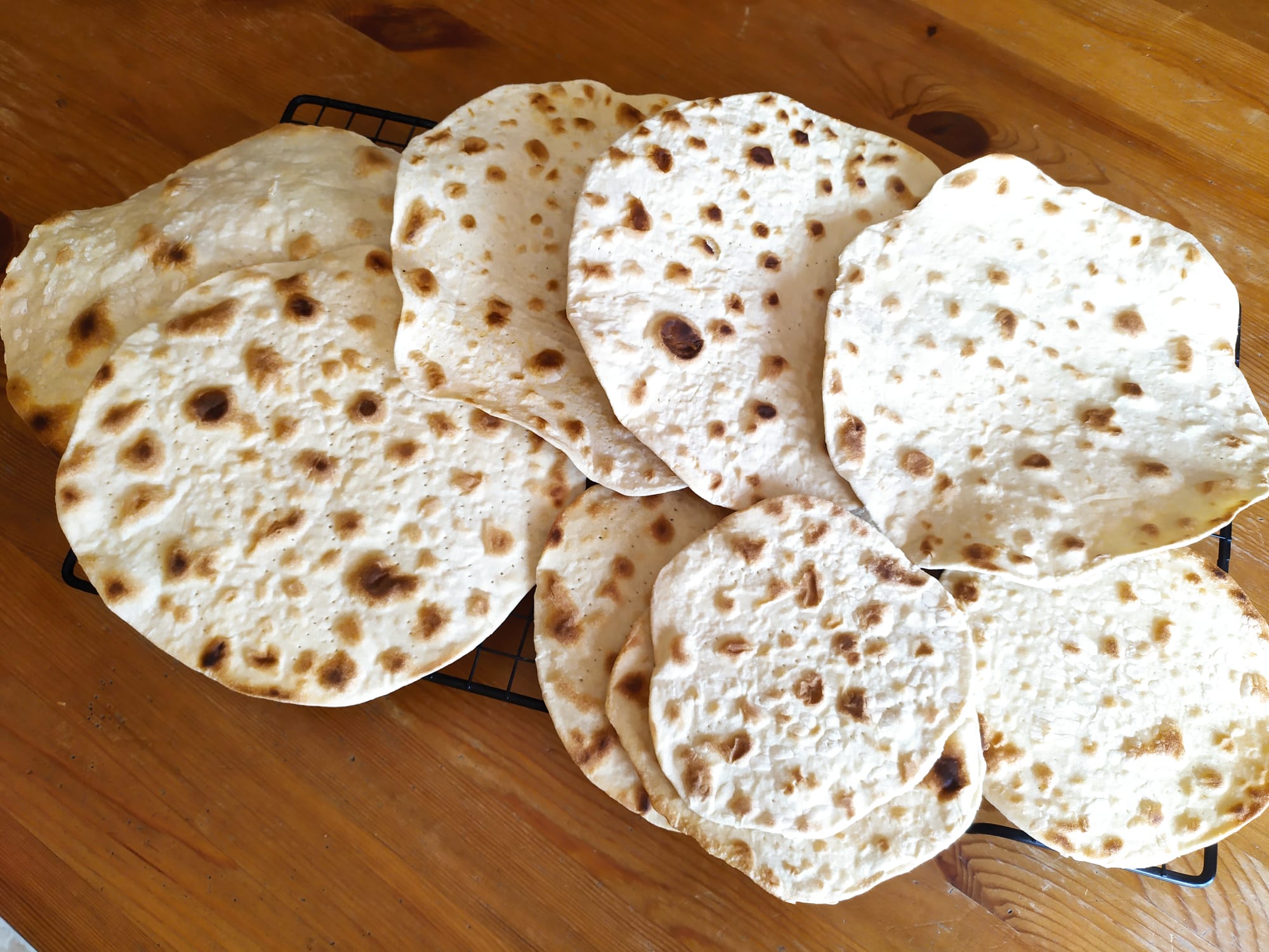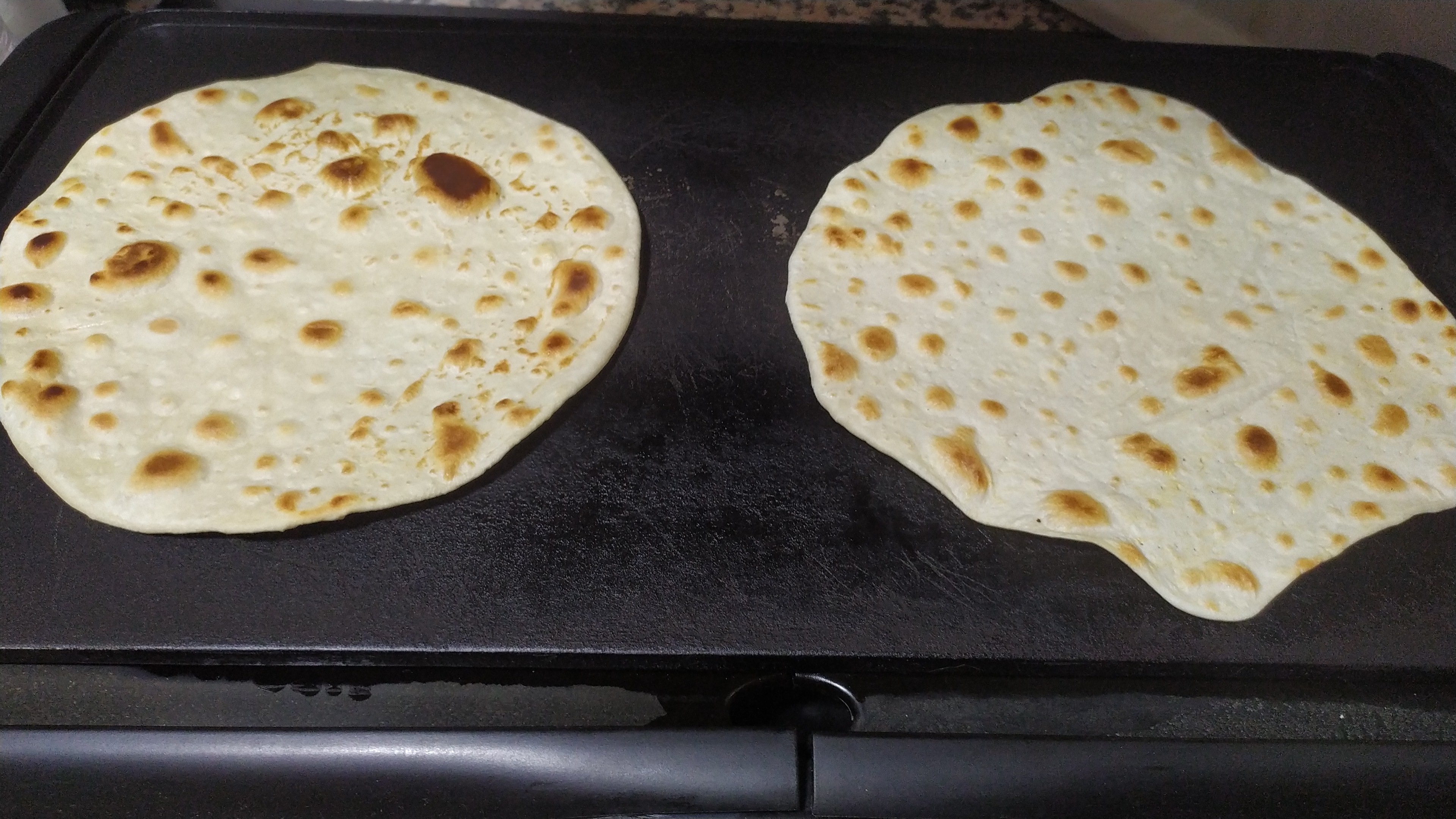 Luego hay que hacer bolitas estirar muy finas y cocinar en sartén o plancha de asar, sin aceite, muy caliente, hasta que veamos que ya están