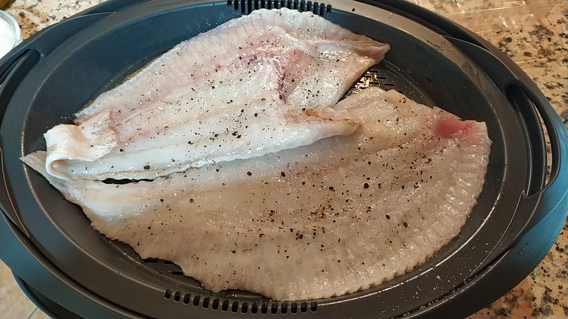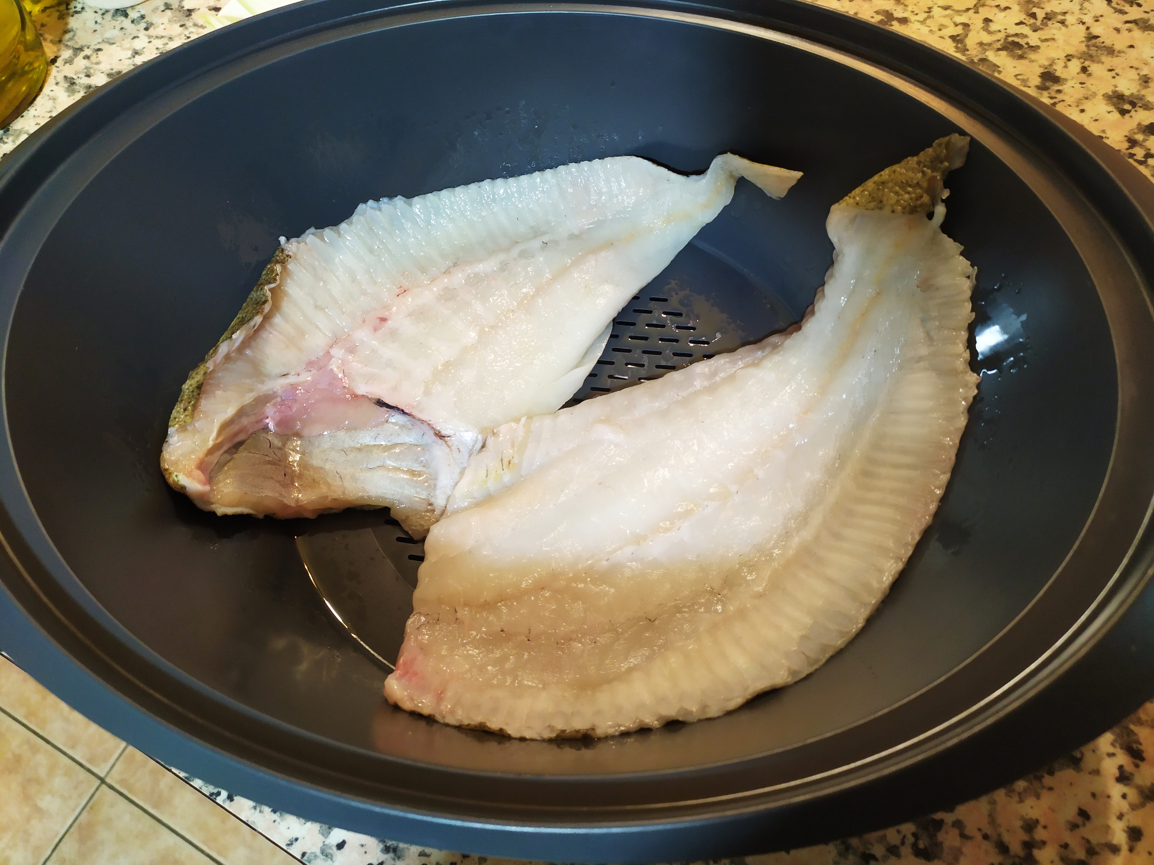 - Engrasa con aceite la bandeja y el recipiente Varoma y reparte los filetes del rodaballo espolvoreados con la sal y la pimienta. Tapa el varoma y reserva.