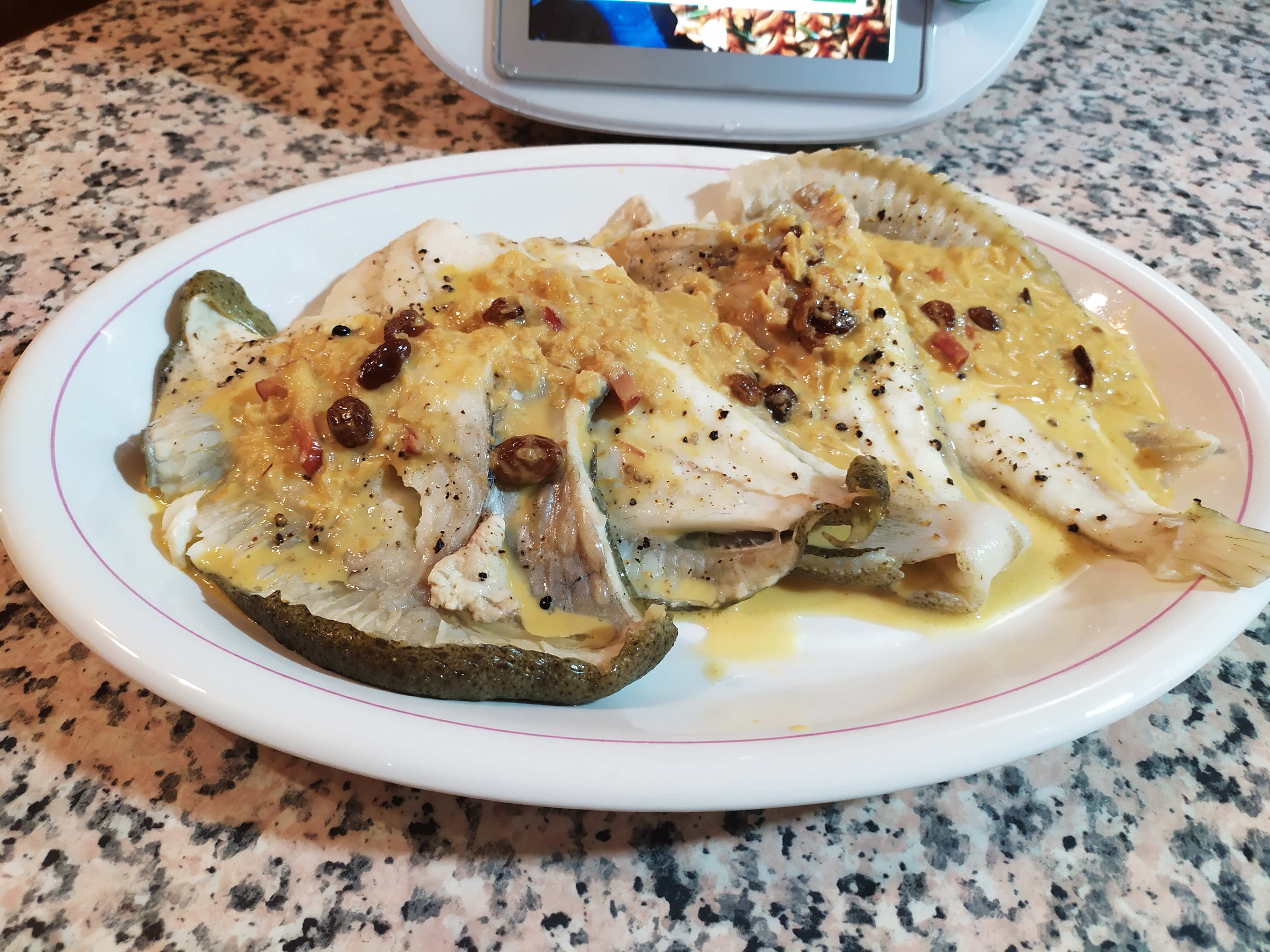 - Añade la nata al vaso y programa 1 min/Varoma/giro inverso/vel 1. Mientras tanto, coloca los filetes de rodaballo en una fuente. Sirve inmediatamente acompañado de la salsa.