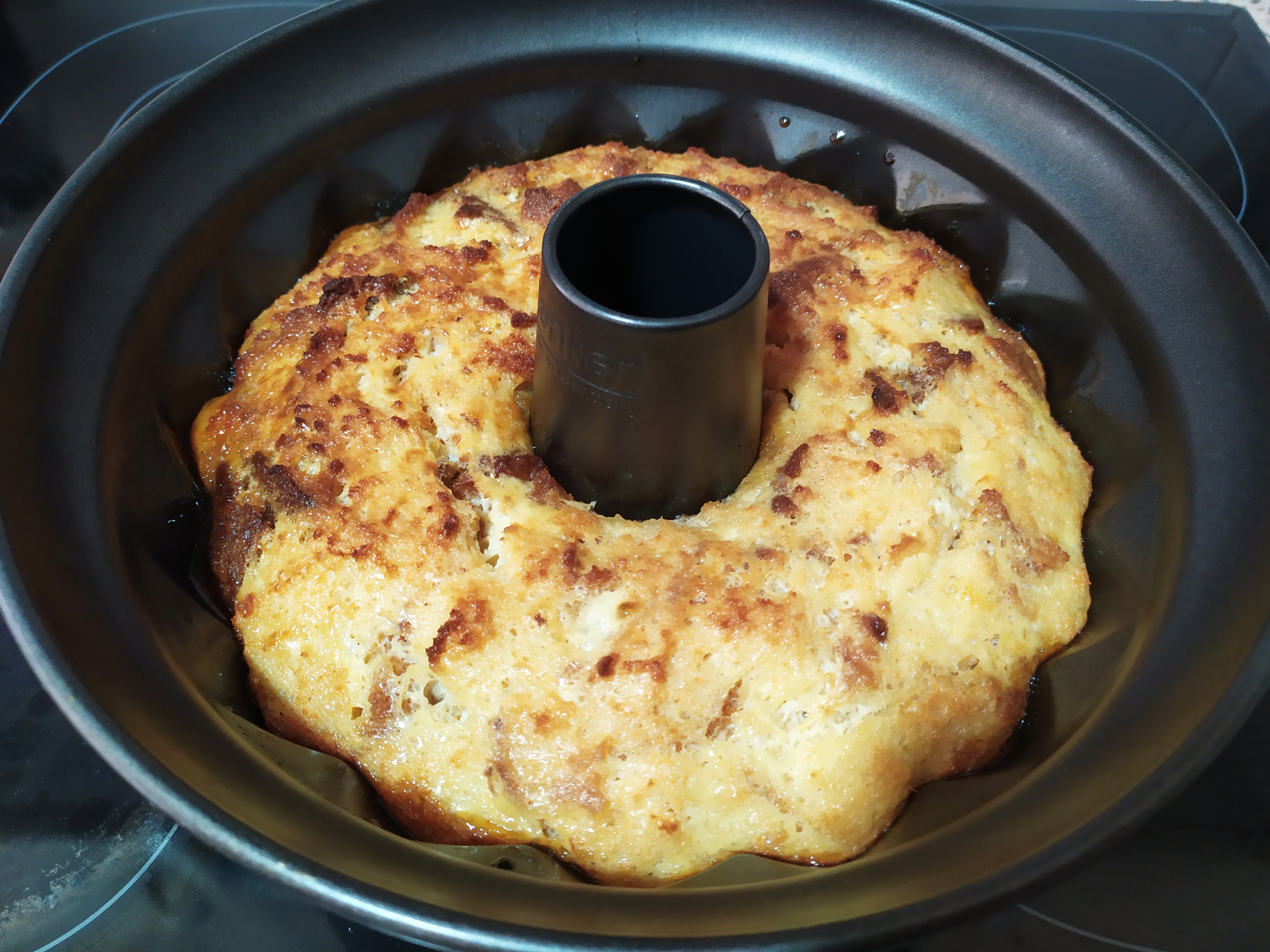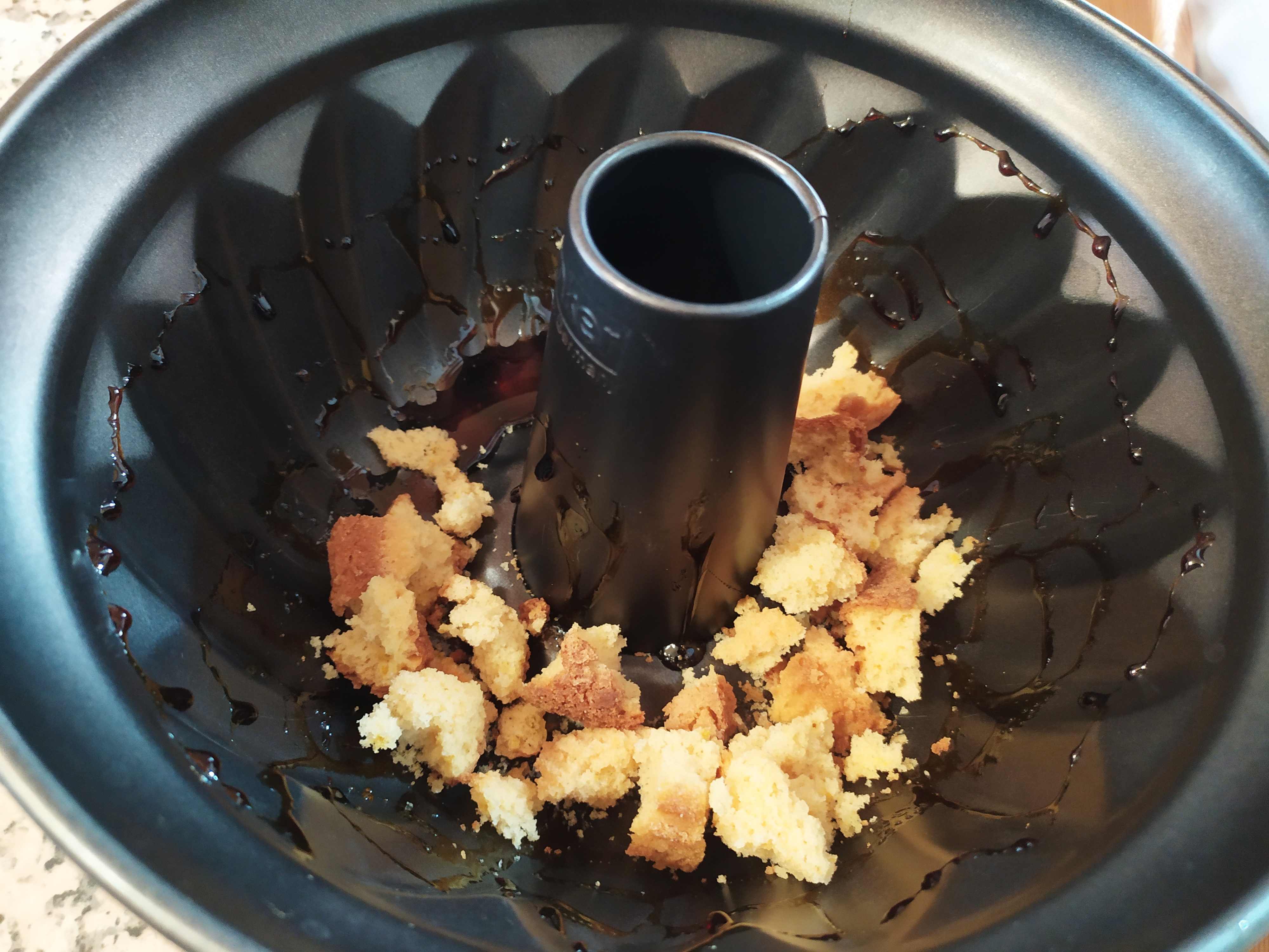 - Caramelizar las paredes y el fondo de un molde de un tamaño adecuado, mínimo de 1,5 litros, para que quepa todo bien. Añadir sobre el caramelo líquido la bollería, que habremos desmenuzado con los dedos. En caso de añadir las pasas maceradas, en cantidad al gusto, lo haríamos en este momento.