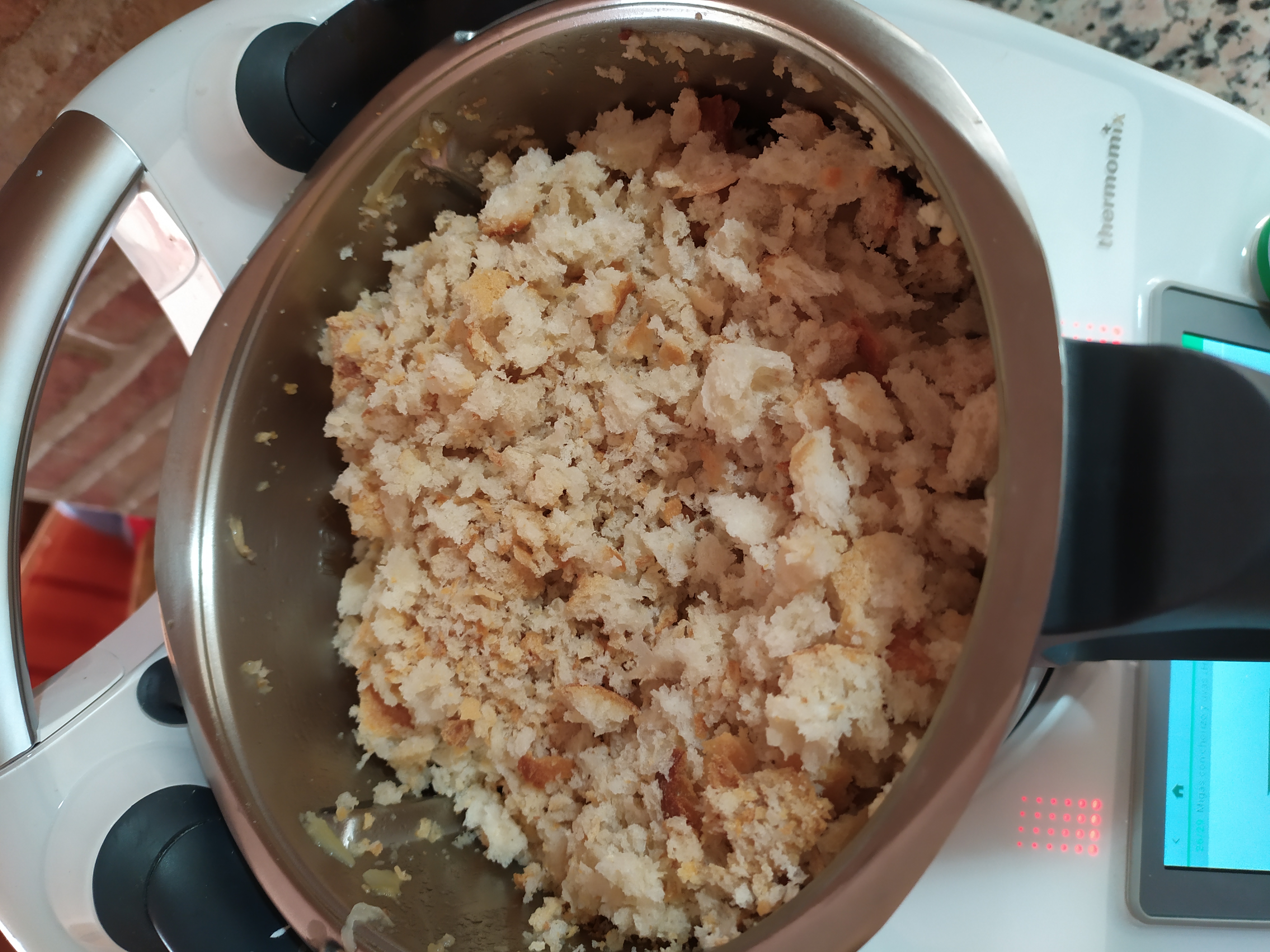 Me encantan las migas de pan. Además, no me gusta tirar el pan, así que de siempre me ha gustado hacerlas. Bueno, no del todo. Más bien me ha gustado comerlas. Mi madre y mi abuela solían hacerlas. Remojaban el pan en un cuenco con agua, lo escurrían, se liaban una hora delante de la sarten...Eso sí, estaban buenísimas. Pero desde que he descubierto como hacer las migas en thermomix...¡¡¡Adiós al dolor de piernas del plantón delante de la sartén!!! En el recetario thermomix podéis encontrar algunas recetas de migas. Yo he ido cogiendo una cosa de aquí, otra de allá, y los ingredientes se los pongo según lo que acostumbraban a poner mi madre y mi yayita.