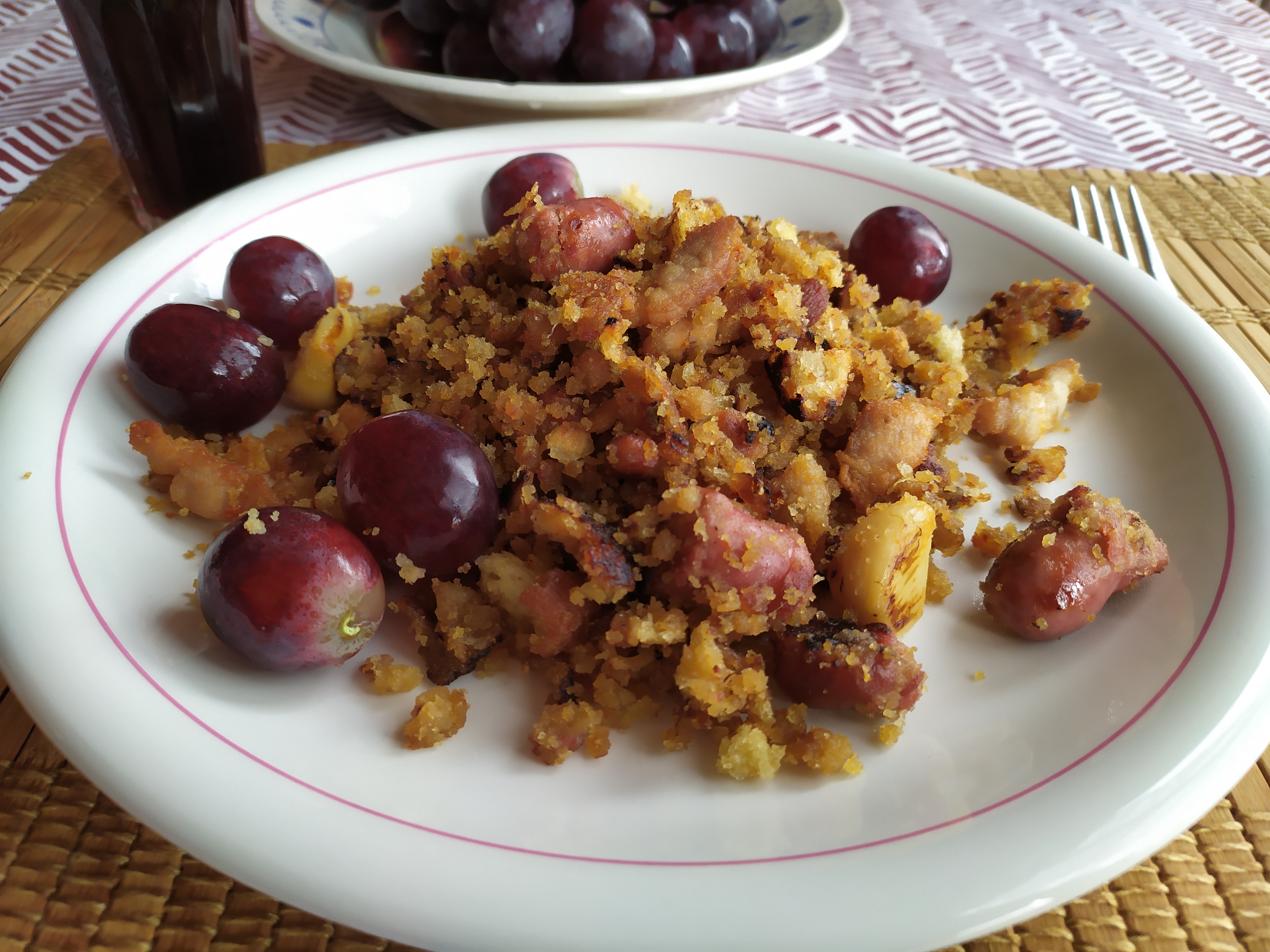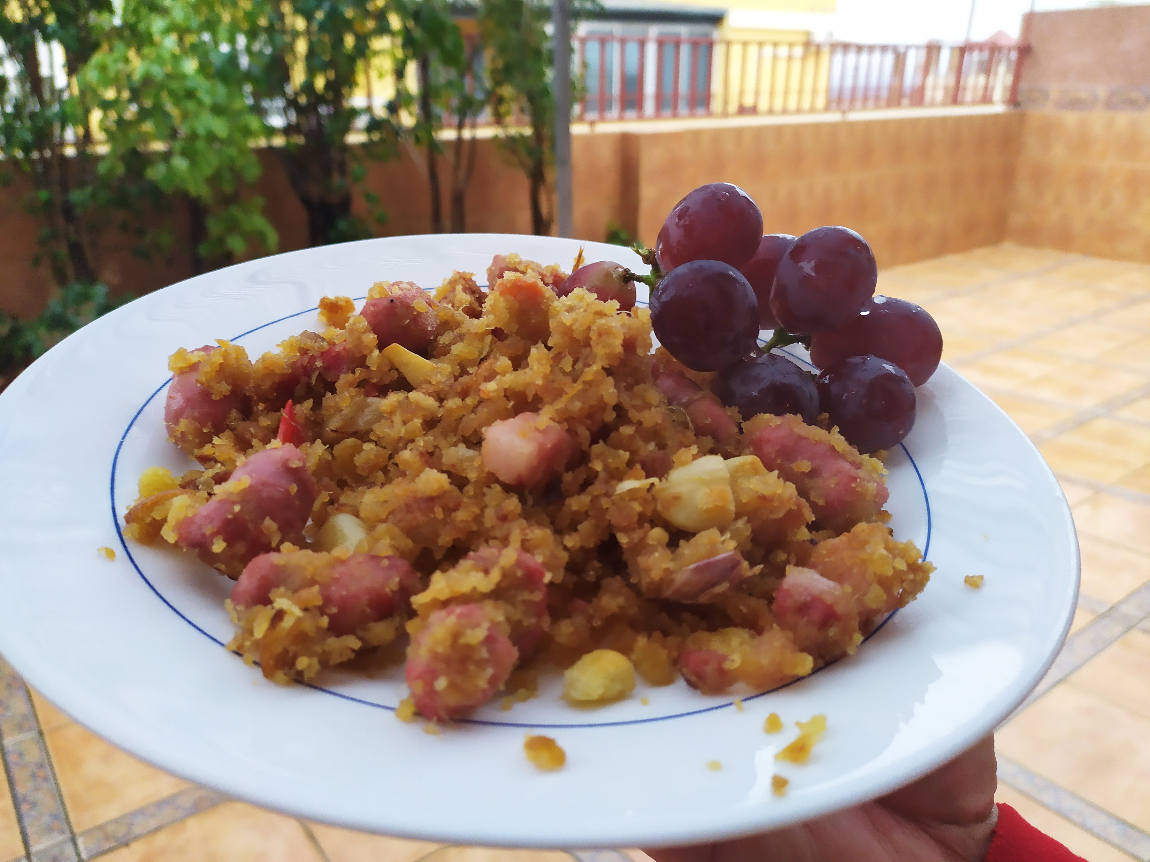 - Cuando falten 5 min para terminar, añadimos por el bocal la longaniza y los ajos. (En mi caso yo añadí los ajos al mismo tiempo que el pan, eso ya, a gustos. Cuando acabe el tiempo salteamos en una sartén honda unos 5 minutos para acabar de dorarlas y que queden sueltas. Servir con uvas o granada