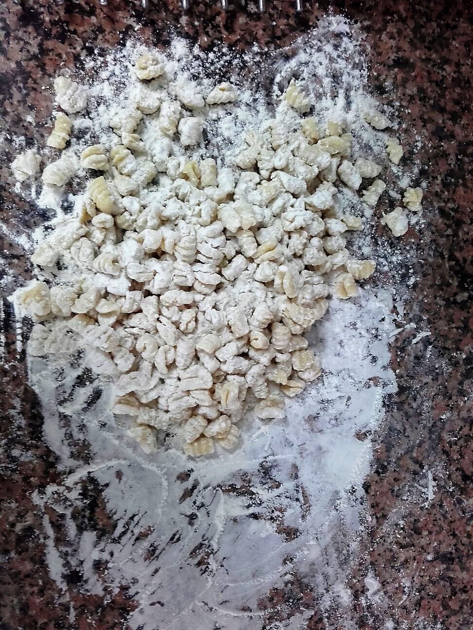 Vuelque la masa en una superficie de trabajo espolvoreada con harina y amase ligeramente formando una bola. Corte porciones de masa y forme cilindros de aprox. 0.25 cm. Corte cada cilindro en trozos de 2 cm y pase por un marcador de ñoquis (también puede hacerlo con tenedor).