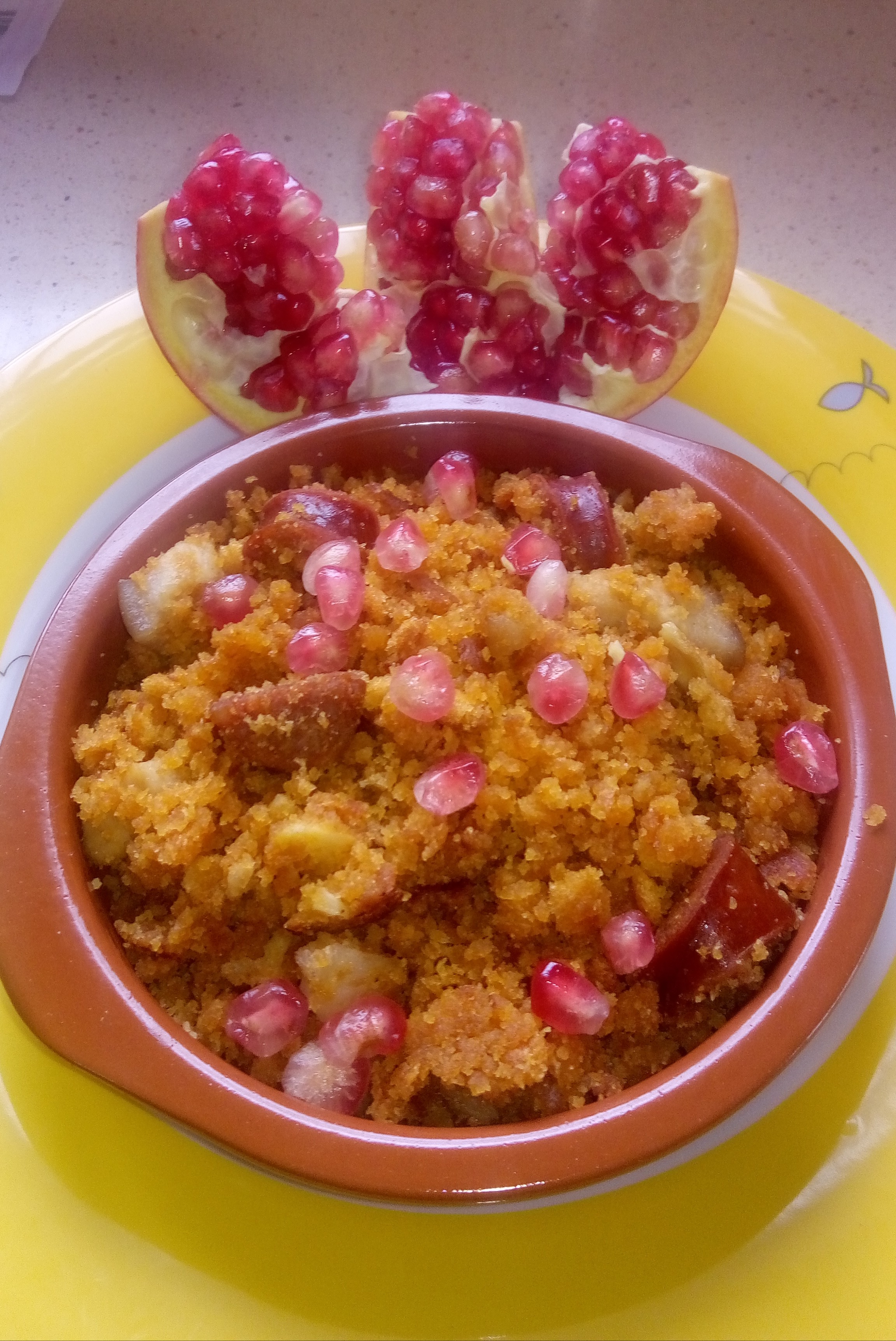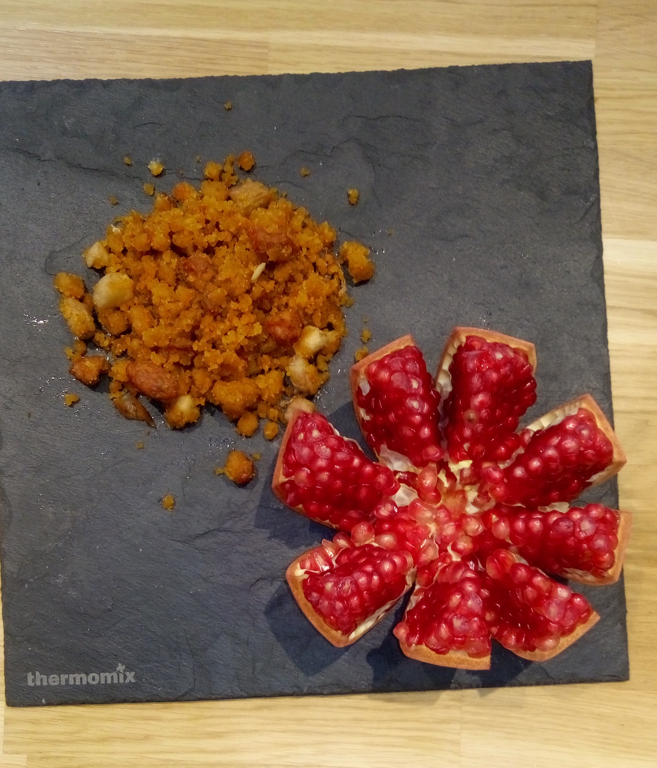 Añadimos las migas restantes, junto con los ajos, chorizo y la panceta reservada y sin poner cubilete, sofreir 13 m/varoma/giro izquierda/vel 1. introducimos espatula por la apertura y removemos de vez en cuando. Ponemos las migas en una sarteny salteamos 3/4 minutos para que queden bien integrados los ingredientes. Ponemos en una fuente o un perol de barro y añadimos granos de granada por encima para tomar mezclada junto con las migas.