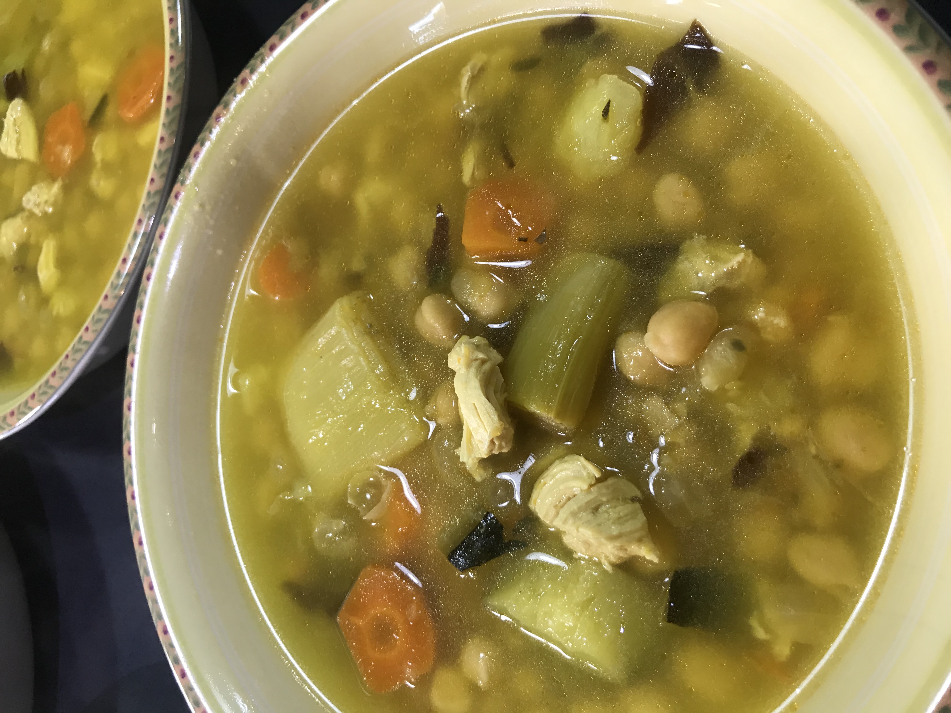~ plato principal: potaje cogiendo el caldo que he triturado cuando he sacado el cestillo, he rectificado el punto de sal y colorante, cúrcuma, pimentón y le he puesto los garbanzos, la patata troceada, la zanahoria y la media pechuga del cestillo. También se puede hacer sopa cubierta o de menudillos, poniendo 4 puñados de fideos 3 min a 100º vel 1