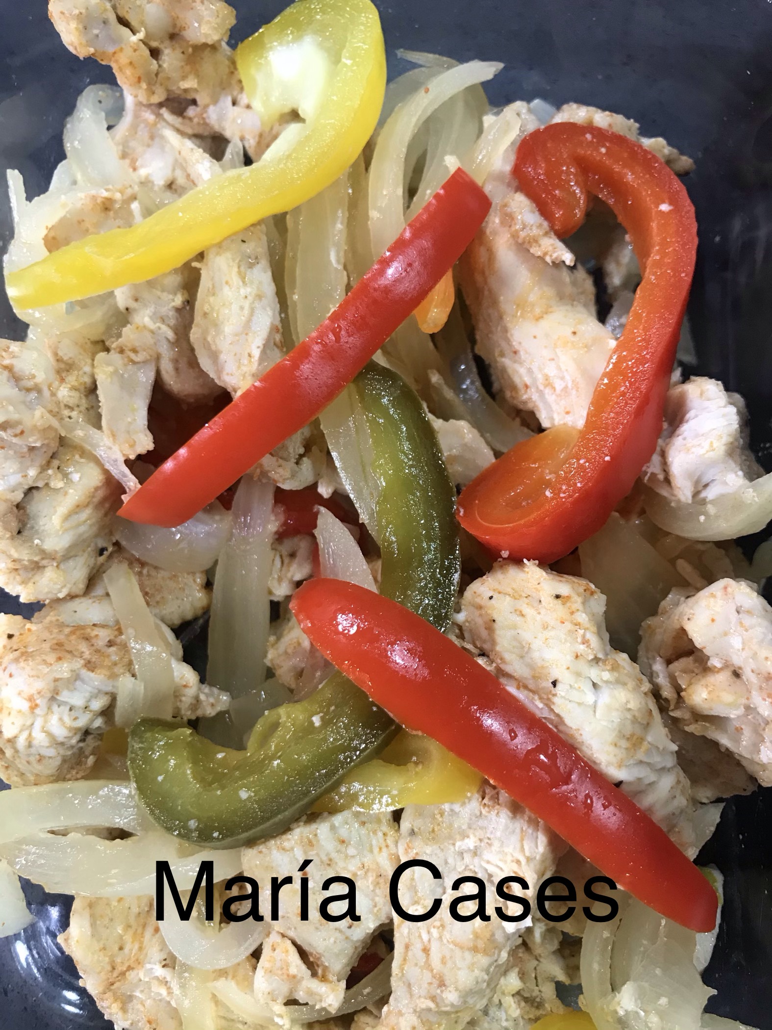 -pechuga pollo en tiras macerado con pimientos, sal, cebolla y ajo en polvo, piemienta y aceite 30 min en un bol