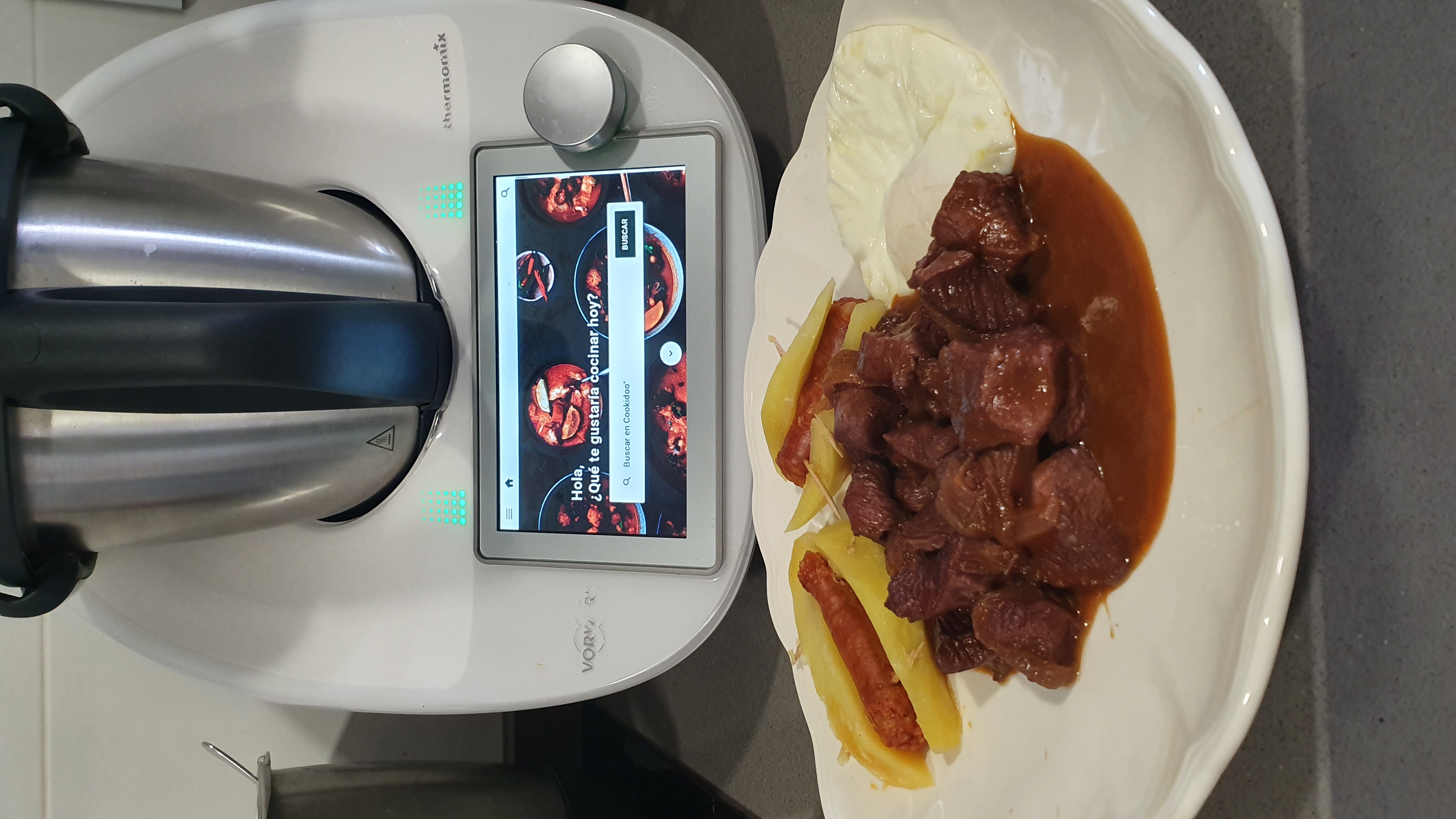 poner 2 dientes de ajo y freir 5 minutos 120grados v2.añadir 120 grs de cebolla y trocear 3 segundos v.3 y freir misma temperatura y velocidad.añadir 800 grs de carrilleras y 2cucharadas de mermelada casera de fresas y 400 de oporto.hacemos los pinchos de chistorra alternando patata y chistorra. Y en la bandeja ponemos los huevos encima de papel de horno mojado .programamos 40 minutos varoma giro a la inversa velocidad 1.