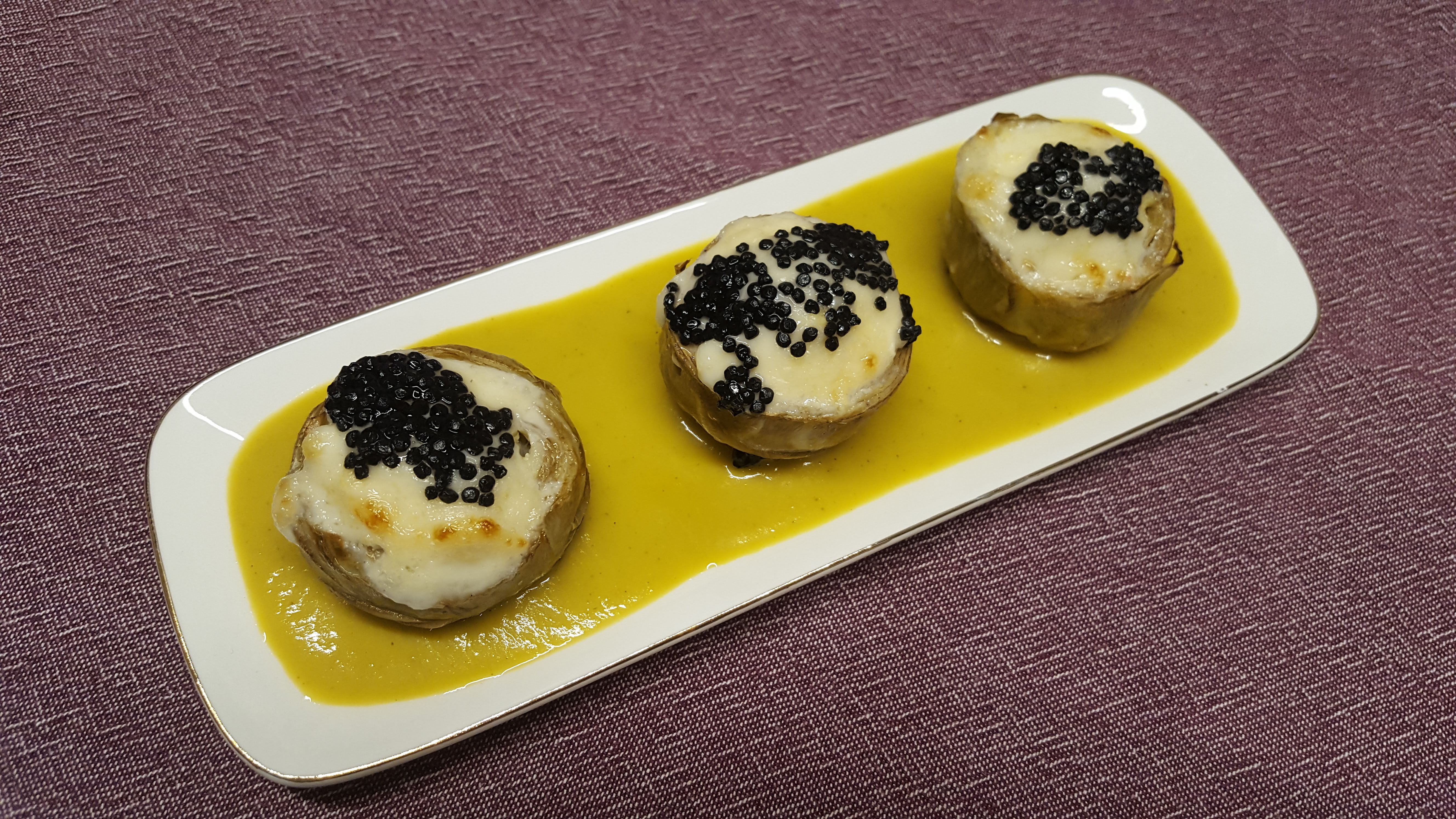 ALCACHOFAS GRATINADAS CON CAVIAR DE MUJOL SOBRE FONDO DE VERDURAS CON THERMOMIX