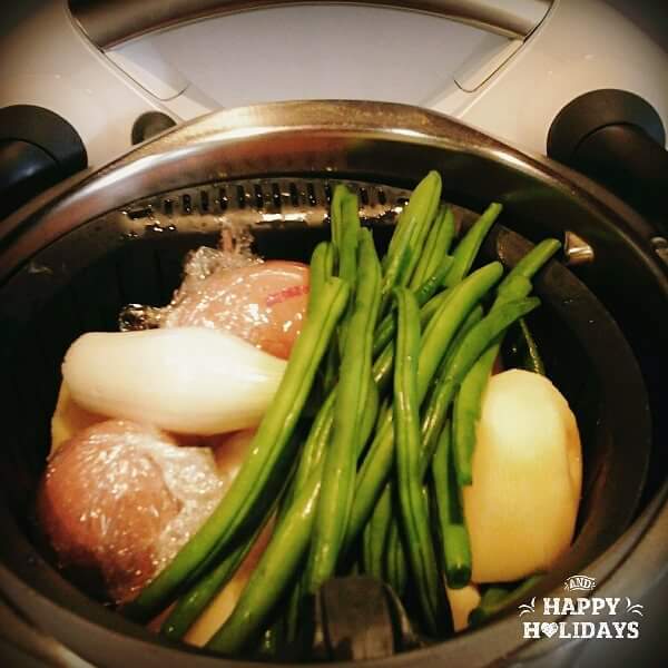 Pelar todas las verduras, colocar en el cestillo y lavar. Personalmente a la cebolla le hago un corte en cruz. Envolver los huevos en film y poner junto a las verduras.