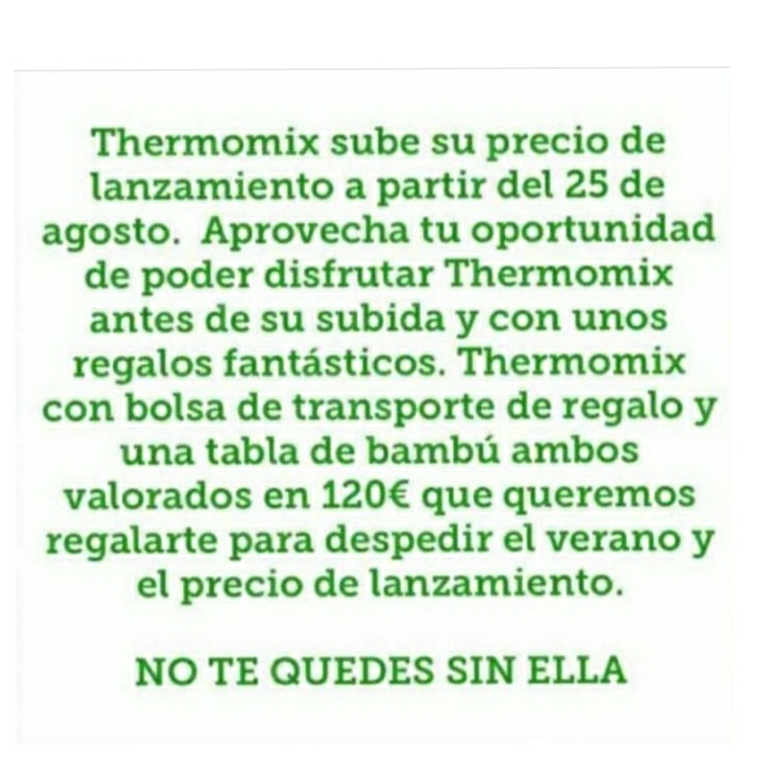 Después de más de un año con ese importe, os puededo anunciar que el próximo día 25 de este mes de Agosto, el precio del Thermomix TM6 se incrementa y pasará a costar 1.299€