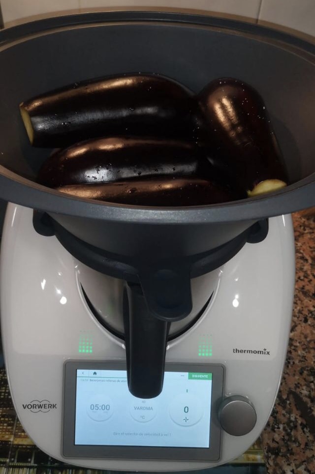 - Corte las berenjenas por la mitad longitudinalmente, hágales un hueco con cuidado de no agujerear la piel y reserve la pulpa que extraiga. Coloque las berenjenas espolvoreadas con sal en el recipiente Varoma con la piel hacia arriba. Tape y reserve.